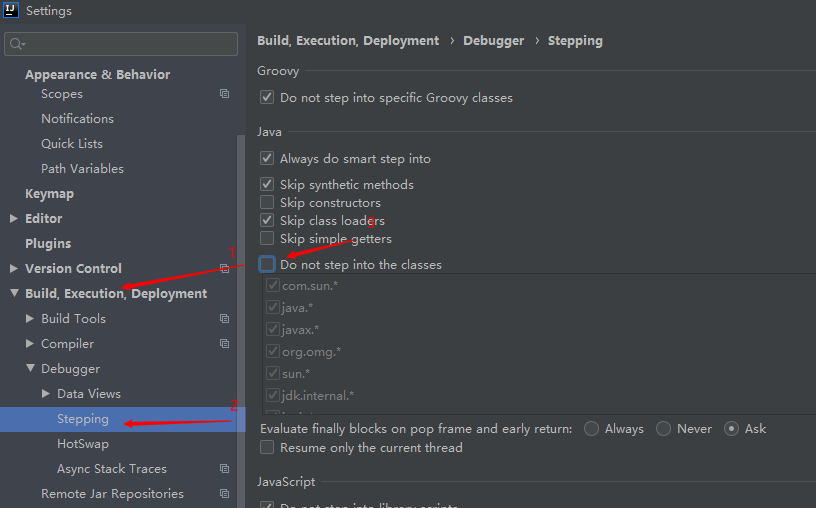 - 然后我们打开jdk设置,找到下图位置 3 ,去掉勾选,这样我们debug按F7就能进入源码区域了