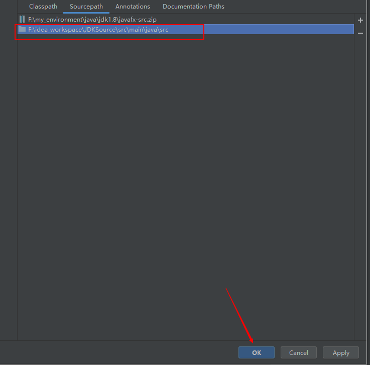 - 添加新的源码位置配置,先点击"+",找到刚刚拷贝过来的src包位置,然后点击ok
