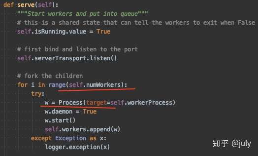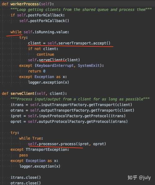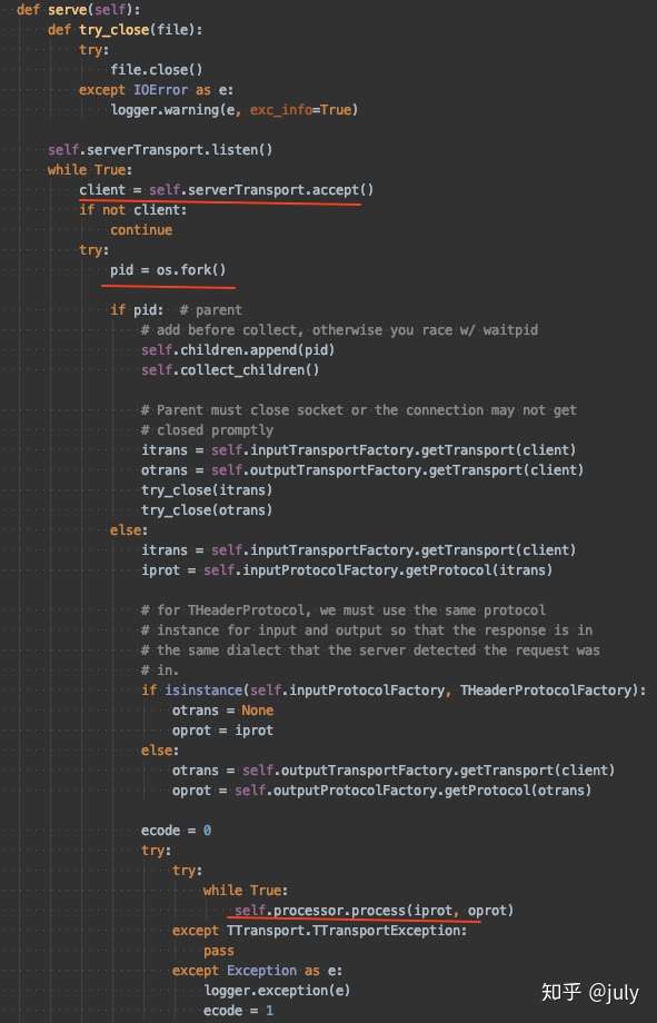 其中 TForkingServer,服务端每次监听到 client 请求,会 os.fork一个子进程进行业务处理。
