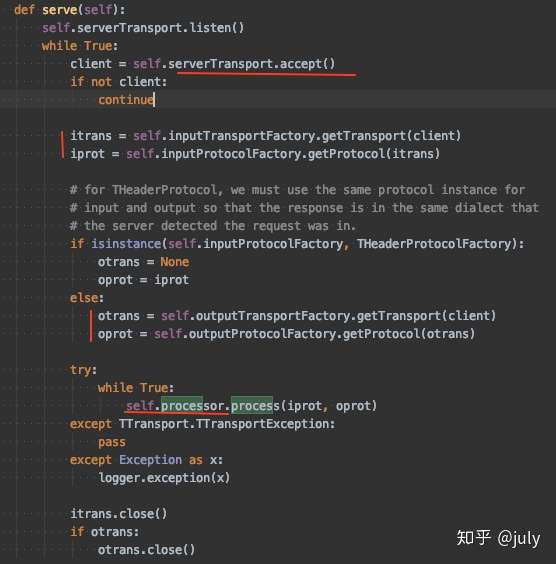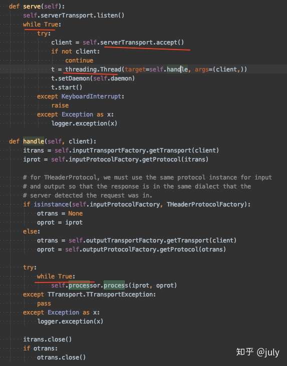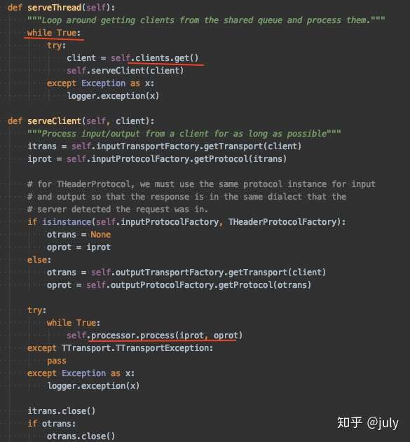 1、首先来看 TThreadedServer,目的是为每个 client 请求创建单独的线程进行业务处理