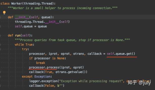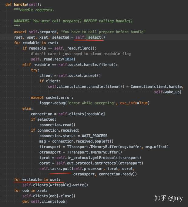 3、最后是 TNonblockingServer,这个稍微复杂一点。类似于 java 版 thrift 中的 THsHaServer,思路是服务启动时创建 threads个线程负责处理 task 队列中的任务消息。而主线程利用 io 多路复用技术将准备好的可读消息放入 task 队列供业务线程处理,同时在处理结束后可写时直接将结果返回给客户端。