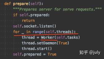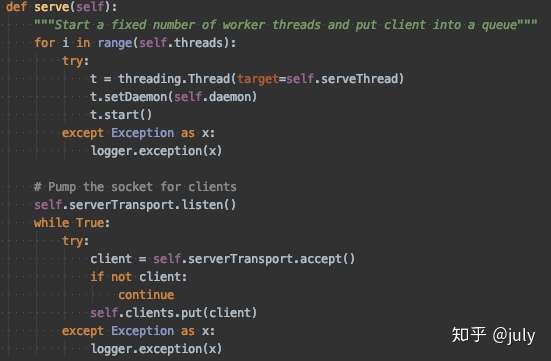 2、然后是 TThreadPoolServer,服务启动时先创建好 self.threads 个线程,每个线程负责从队列 clients 中获取客户端连接TSocket 对象。而主线程负责 accept 客户端的连接并创建 TSocket 对象,放入 clients 队列。