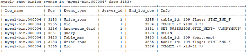 该方式不好观察,使用 show binlog events in 'ysql-bin.000004'; 这种形式可以方便的观察内容。从指定索引位置开始查看: show binlog events in 'mysql-bin.000004' from 3183;
