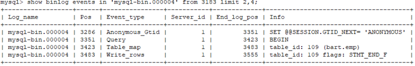 show binlog events in 'mysql-bin.000004' from 3183 limit 2,4; 分页查询