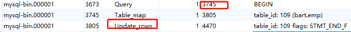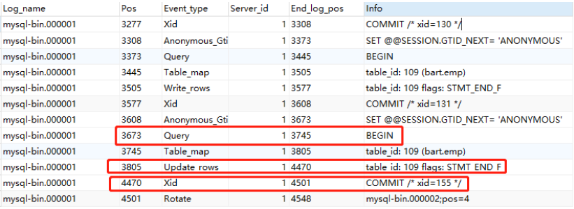可以看到红圈标注的是 update 操作的 pos,在他之前有个 begin 事物开始点(pos 是 3745)之后有个 commit 事务提交(pos 是 4501)我们需要恢复没有被更新之前的状态,所以我们的使用 pos 恢复的 stop-postion 就是事务的开始索引位置即 3745,恢复命令为: