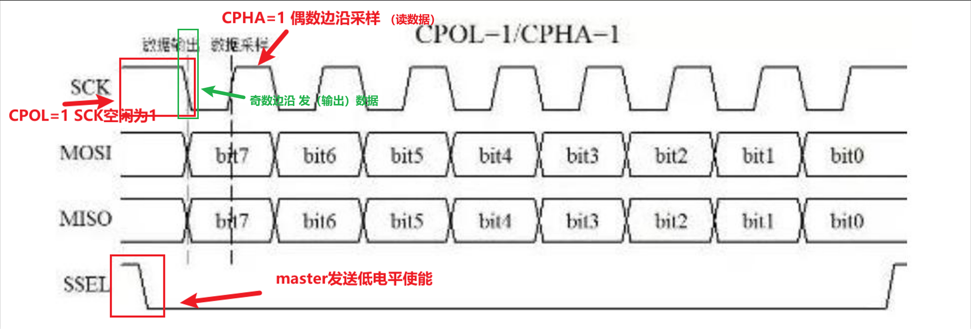 Polarity极性(CPOL) 空闲时SCK的电平(与极性相同) 采样时刻(与相位相反0 奇 1 偶) 0 1 高电平1 奇数边沿 0 0 低电平0 奇数边沿 1 1 高电平1 偶数边沿 1 0 低电平0 偶数边沿