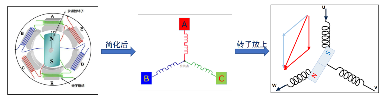 - F:电机产生的 “合成磁力”(可以想象成拉着转子转的 “看不见的绳子”)。