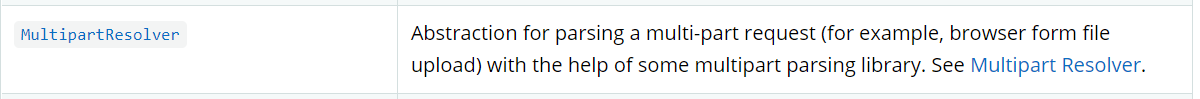 这个翻译大概是什么意思(机器翻译):对于多部份请求,(打个比方,浏览器中文件的上传)可以通过多部份依赖进行解析,请看 Multipart Resolver