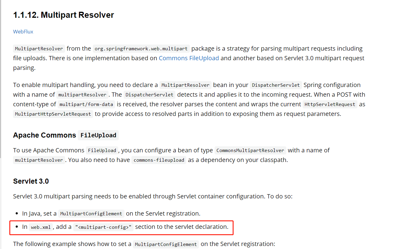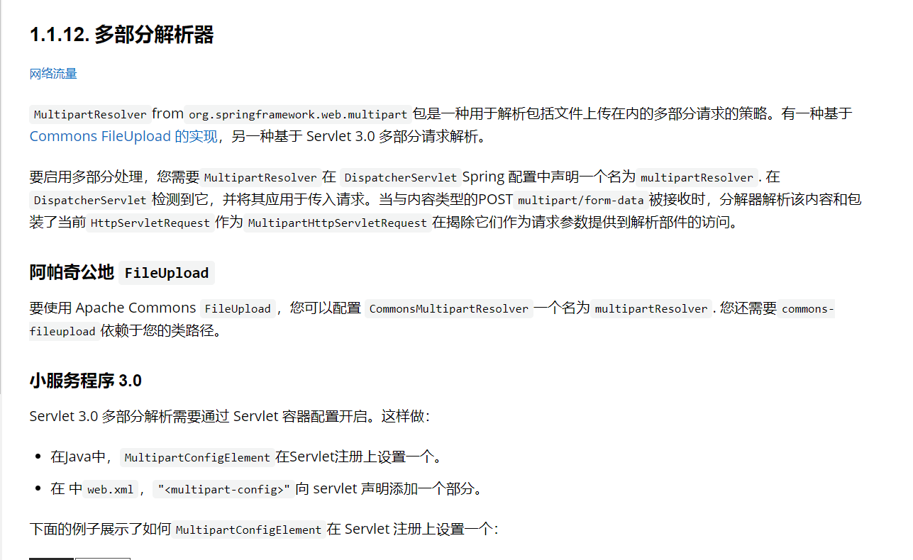 可以看到,这里明确的告诉你,处理这样的mulitipart数据,需要使用对应的解析器,而这个解析器可以在java中设置或者web.xml中声明,而下面的例子则是java,可能是我对官网的不了解,所以没找到xml,但是主流的spring文档中,是主张使用java 的配置,spring实战也是,不过spring实战站在了开发者的视角,所以考虑了在servlet2.0的时代,而在不停前进的spring中,servlet2.0处于一个不受待见的地位。