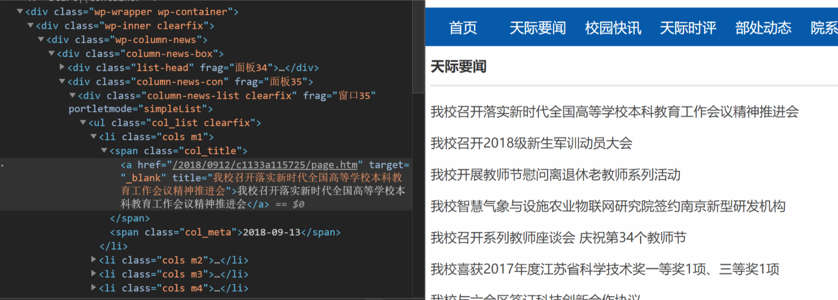 啥意思呢,上面图片我们可以看到一堆层级关系我们不管,我们只找新闻标签a和父级,a有target属性值为_blank,那么a[@target='_blank']就是标签名字为a,属性叫target且值为_blank的元素