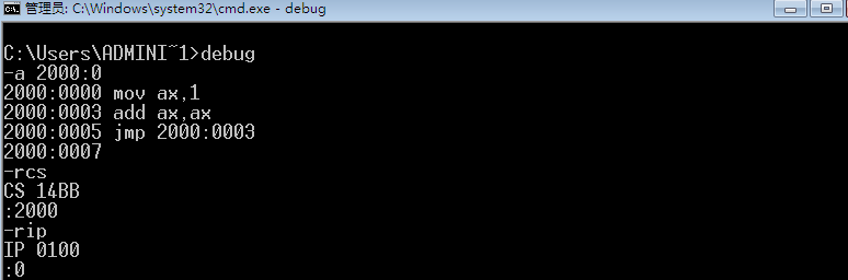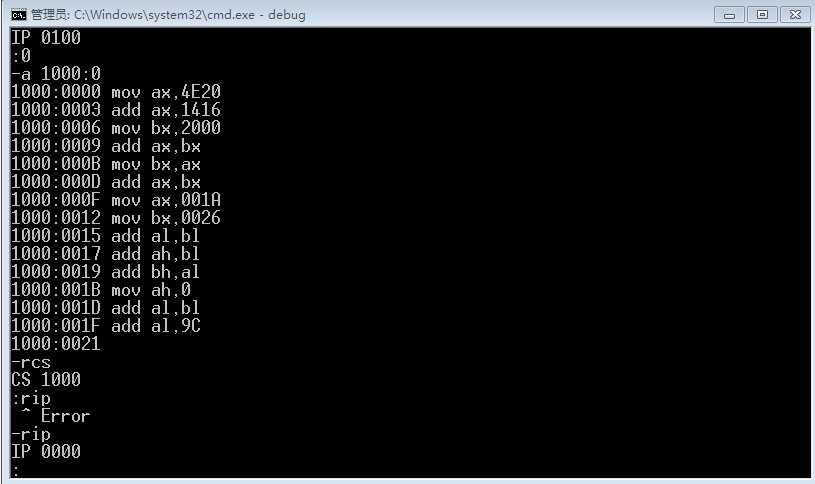 (1)首先使用r模式改变cs ip的指向地址,输入rcs,跳出当前cs段地址,再输入1000更改cs