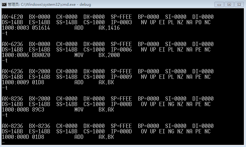 总结:可见cs段地址暂时不变,ip递增3,说明指令每次读取后,ip自动指向下一命令所在单元保证命令的执行。