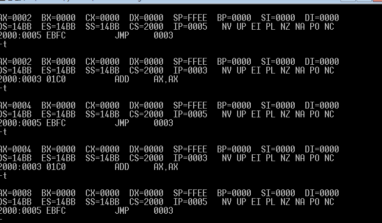 mov ax,ax位于2000:3位置,而下一位置2000:5则是jmp 2000:3,也就是说重复mov ax,ax这个指令