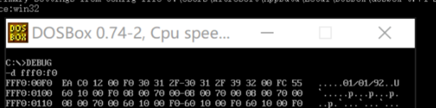 用d指令查看fff0:0数据,每次只能查看32kb数据,右侧显示的是可转移数据,可见无意义
