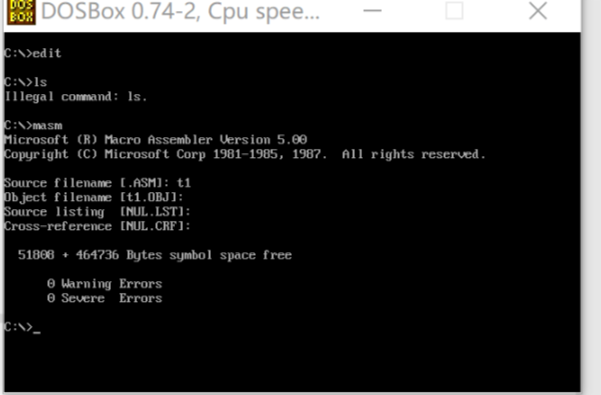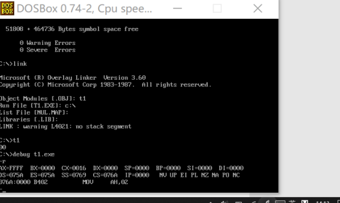 运行masm进行编译第一行输入文件名t1默认为.asm文件,若是txt则写t1.txt,后面可以先全部enter