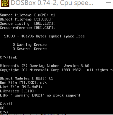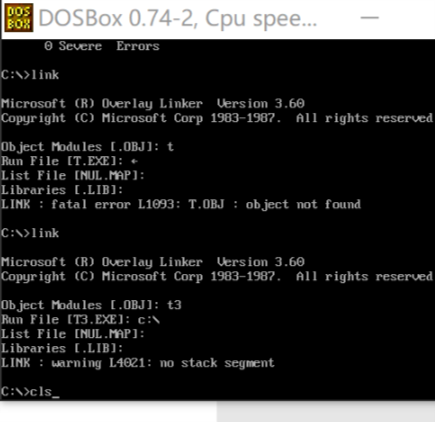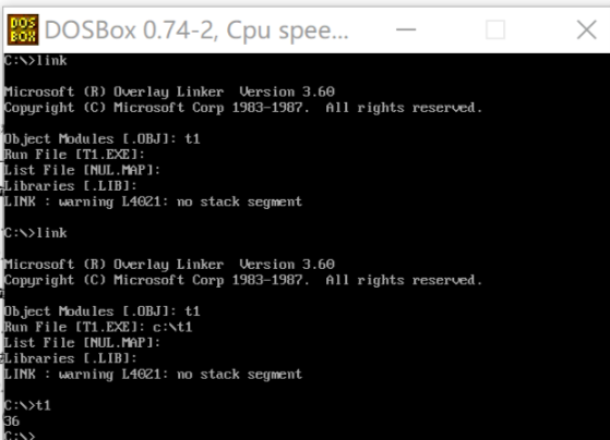 生成.obj,运行link链接器,第一行输入t1(刚刚的obj文件名字),run file可以直接enter生成在默认目录下面,也可以c:\生成在指定位置(挂载的目录)