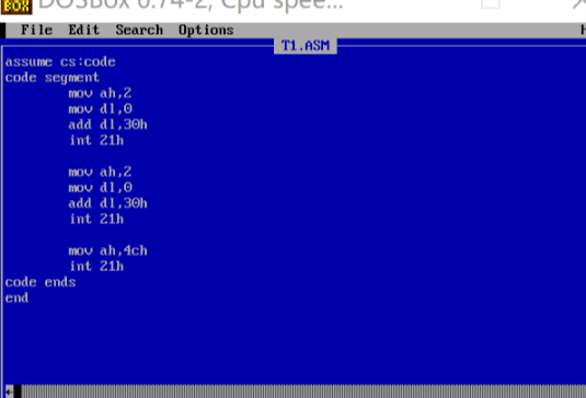 在dos下使用edit工具进行编辑代码t1.asm,使用alt键调出菜单保存