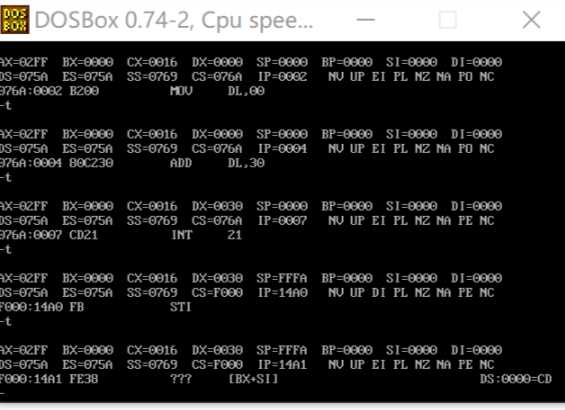 进行t单步调试,运行到int21结束