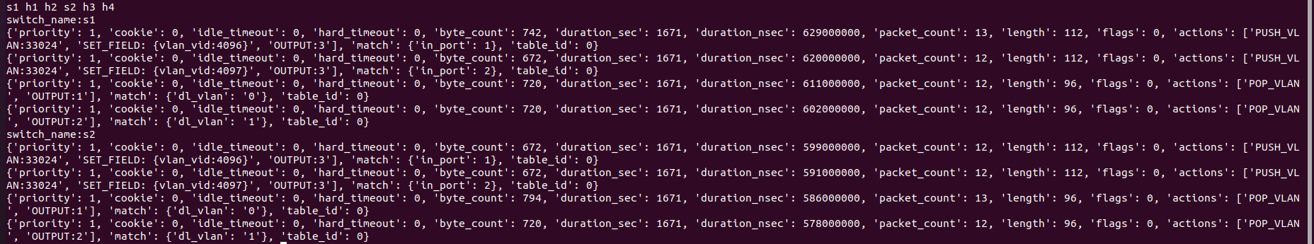 { "flows": [ { "dpid": 1, "priority": 1, "match": { "in_port": 1 }, "actions": [{ "type": "PUSH_VLAN", "ethertype": 33024 }, { "type": "SET_FIELD", "field": "vlan_vid", "value": 4096 }, { "type": "OUTPUT", "port": 3 } ] }, { "dpid": 1, "priority": 1, "match": { "in_port": 2 }, "actions": [{ "type": "PUSH_VLAN", "ethertype": 33024 }, { "type": "SET_FIELD", "field": "vlan_vid", "value": 4097 }, { "type": "OUTPUT", "port": 3 } ] }, { "dpid": 1, "priority": 1, "match": { "vlan_vid": 0 }, "actions": [{ "type": "POP_VLAN", "ethertype": 33024 }, { "type": "OUTPUT", "port": 1 } ] }, { "dpid": 1, "priority": 1, "match": { "vlan_vid": 1 }, "actions": [{ "type": "POP_VLAN", "ethertype": 33024 }, { "type": "OUTPUT", "port": 2 } ] }, { "dpid": 2, "priority": 1, "match": { "in_port": 1 }, "actions": [{ "type": "PUSH_VLAN", "ethertype": 33024 }, { "type": "SET_FIELD", "field": "vlan_vid", "value": 4096 }, { "type": "OUTPUT", "port": 3 } ] }, { "dpid": 2, "priority": 1, "match": { "in_port": 2 }, "actions": [{ "type": "PUSH_VLAN", "ethertype": 33024 }, { "type": "SET_FIELD", "field": "vlan_vid", "value": 4097 }, { "type": "OUTPUT", "port": 3 } ] }, { "dpid": 2, "priority": 1, "match": { "vlan_vid": 0 }, "actions": [{ "type": "POP_VLAN", "ethertype": 33024 }, { "type": "OUTPUT", "port": 1 } ] }, { "dpid": 2, "priority": 1, "match": { "vlan_vid": 1 }, "actions": [{ "type": "POP_VLAN", "ethertype": 33024 }, { "type": "OUTPUT", "port": 2 } ] } ] }