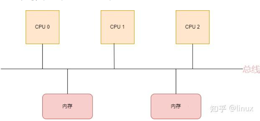 在这种架构中,所有的CPU都是通过一条总线来访问内存,我们把这种架构叫做SMP架构(Symmetric Multi-Processor),也就是对称多处理器结构。可以看出来,SMP架构有下面4个特点: