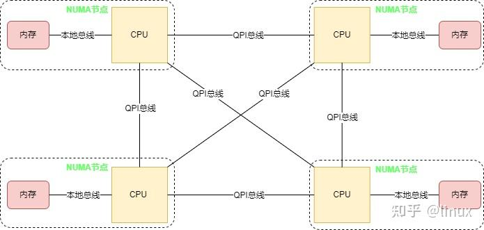 为了解决SMP架构下不断增多的CPU Core导致的性能问题,NUMA架构应运而生,NUMA调整了CPU和内存的布局和访问关系,具体示意如下图: