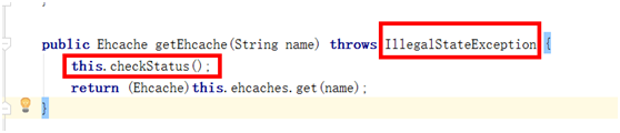 private net.sf.ehcache.CacheManager getCacheManager() { net.sf.ehcache.CacheManager cacheManager = ((EhCacheCacheManager) this.ehCacheCacheManager).getCacheManager(); if (cacheManager == null || cacheManager.getStatus().intValue() == 2) {//等于2表示当前状态为关闭状态 //在spring boot devtools 页面重启的时候,cacheManager会报当前缓存已经关闭的异常, // 所以在状态为关闭情况下,这里需要重新设置一下 try { CacheManager cacheManager1 = CacheManager.create(ResourceUtils.getInputStreamForPath("classpath:ehcache.xml")); ((EhCacheCacheManager) this.ehCacheCacheManager).setCacheManager(cacheManager1); return cacheManager1; } catch (Exception e) { throw new RuntimeException("initialize cacheManager failed"); } } return cacheManager; }