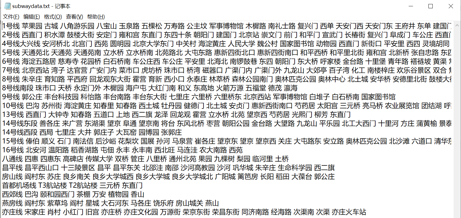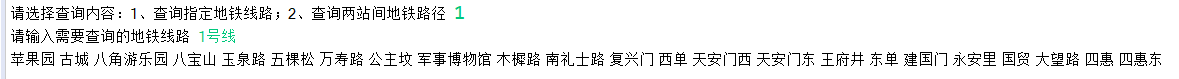 计算指定两站之间最短(最少经过站数)乘车路线;输出指定地铁线路的所有站点。以北京地铁为例,地铁线路信息保存在subwaydata.txt中,格式如下:
