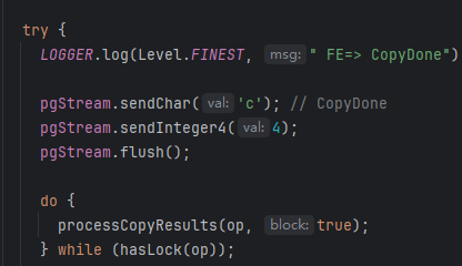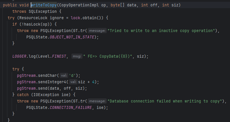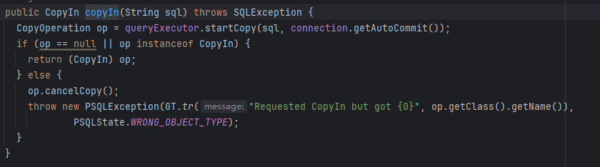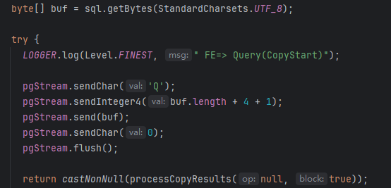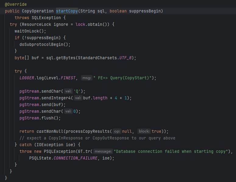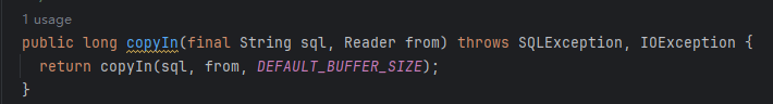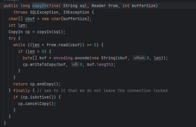 流程很清晰:使用该sql新建一个CopyIn,每次写入bufferSize个char(最后一次除外),直到写完,执行cp.endCopy(),结束copy(cp.cancelCopy()可以大致理解为close,作用大概就是清缓存,未放入流程)。