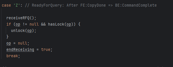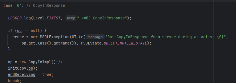 查阅官方文档可知,CopyInResponse的消息以'G'标识,查找到对应处理位置: