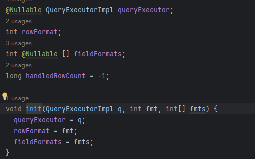 实际上,发送过来的消息肯定不止一个字符'Q',还有一部分指示发送行格式和列数量和格式的部分,其它的部分在初始化接收并处理,最终设置为CopyDualImpl对象的属性,最终实现部分如下: