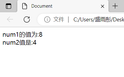document.write(`num1的值为:${num1}<br>num2值是:${num2}`)