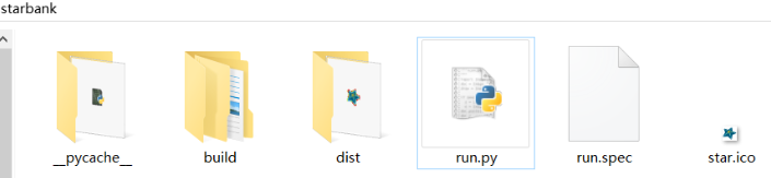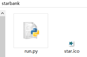 startbank: 是文件夹(星星银行),我直接放在桌面run.py: 是你的Python文件star.ico: 是你程序的图标 (图标制作下面讲解)