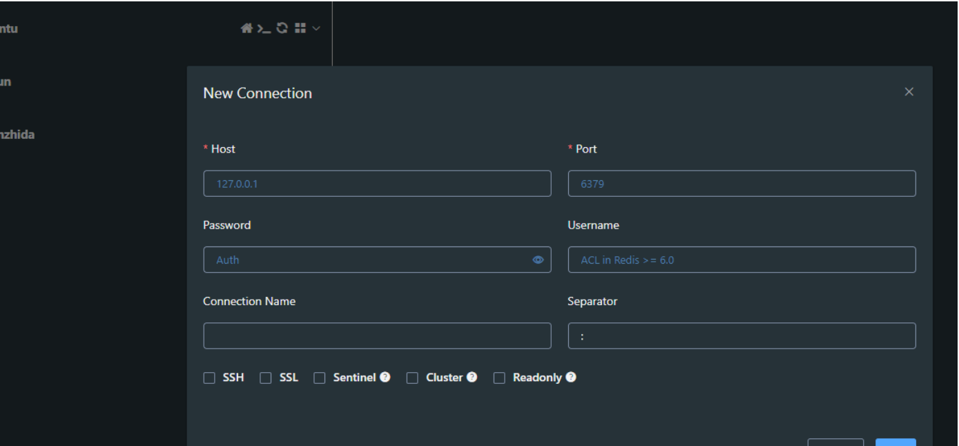 sudo snap install another-redis-desktop-managerTips: 如果选择私钥时提示权限不足,执行sudo snap connect another-redis-desktop-manager:ssh-keys来获取对~/.ssh文件夹的权限