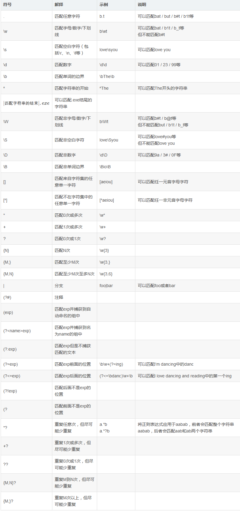 在编写处理字符串的程序或网页时,经常会有查找符合某些复杂规则的字符串的需要。正则表达式就是用于描述这些规则的工具。换句话说,正则表达式就是记录文本规则的代码。学了这个现在还是很懵逼,还好以后应用时可以先去网上搜搜正则表达大全,另外推荐大家《正则表达式30分钟入门教程》。读完这篇文章后再来看看下面的表格,也许你会有更多收获。
