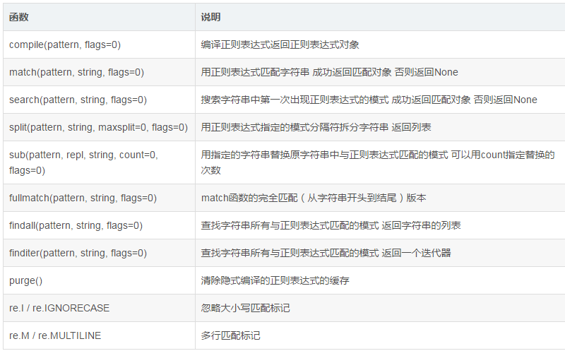 python中的re模块支持正则表达式的操作,下表列出了该模块的核心参数,当我们设计的正则表达式太长或要重复使用时时,可以先放在compile里面,以后直接调用。