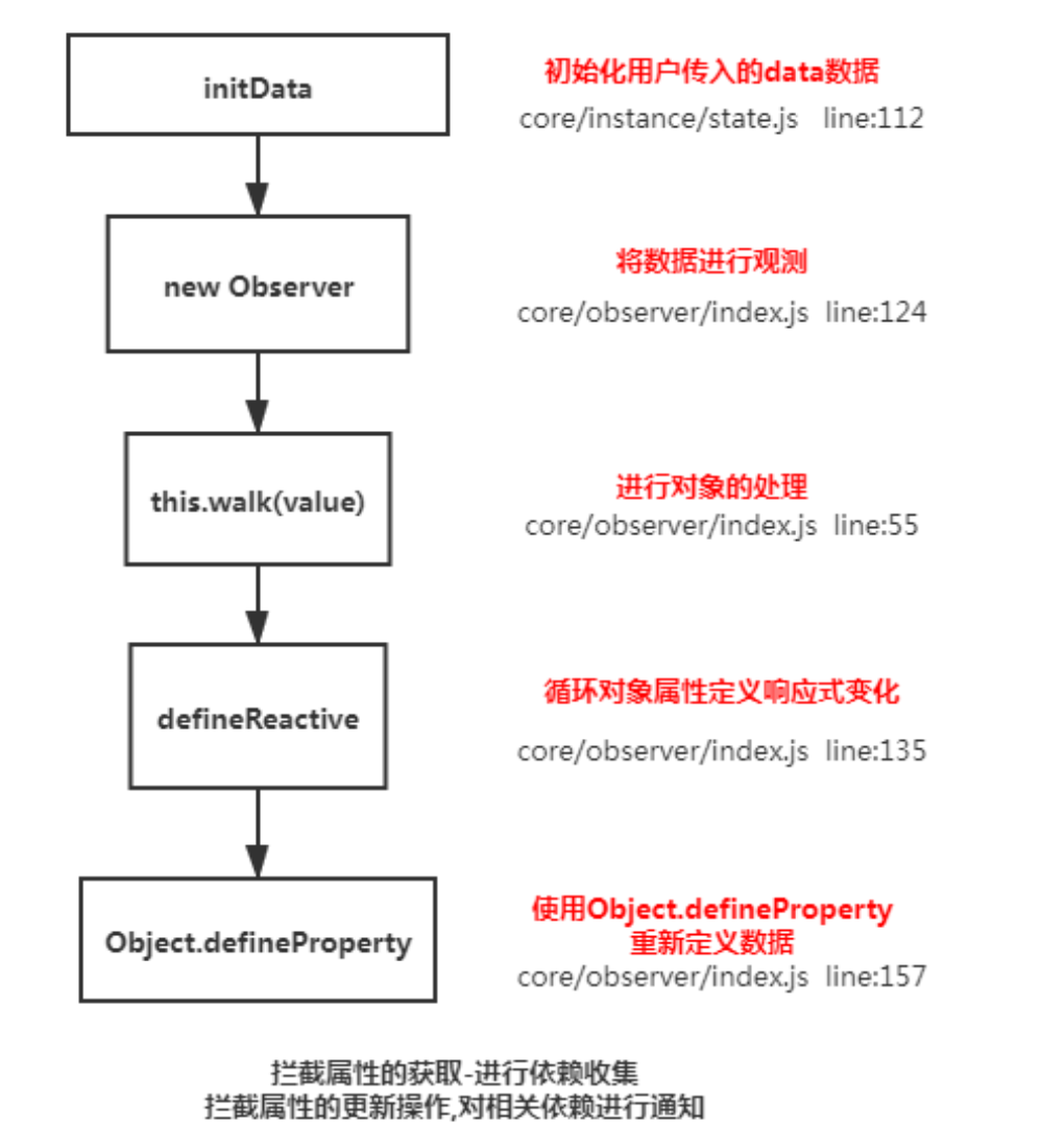 对象内部通过 defineReactive 方法,使用 Object.defineProperty 来劫持各个属性的 setter、getter(只会劫持已经存在的属性),数组则是通过重写数组7个方法来实现。当页面使用对应属性时,每个属性都拥有自己的 dep 属性,存放他所依赖的 watcher(依赖收集),当属性变化后会通知自己对应的 watcher 去更新(派发更新)