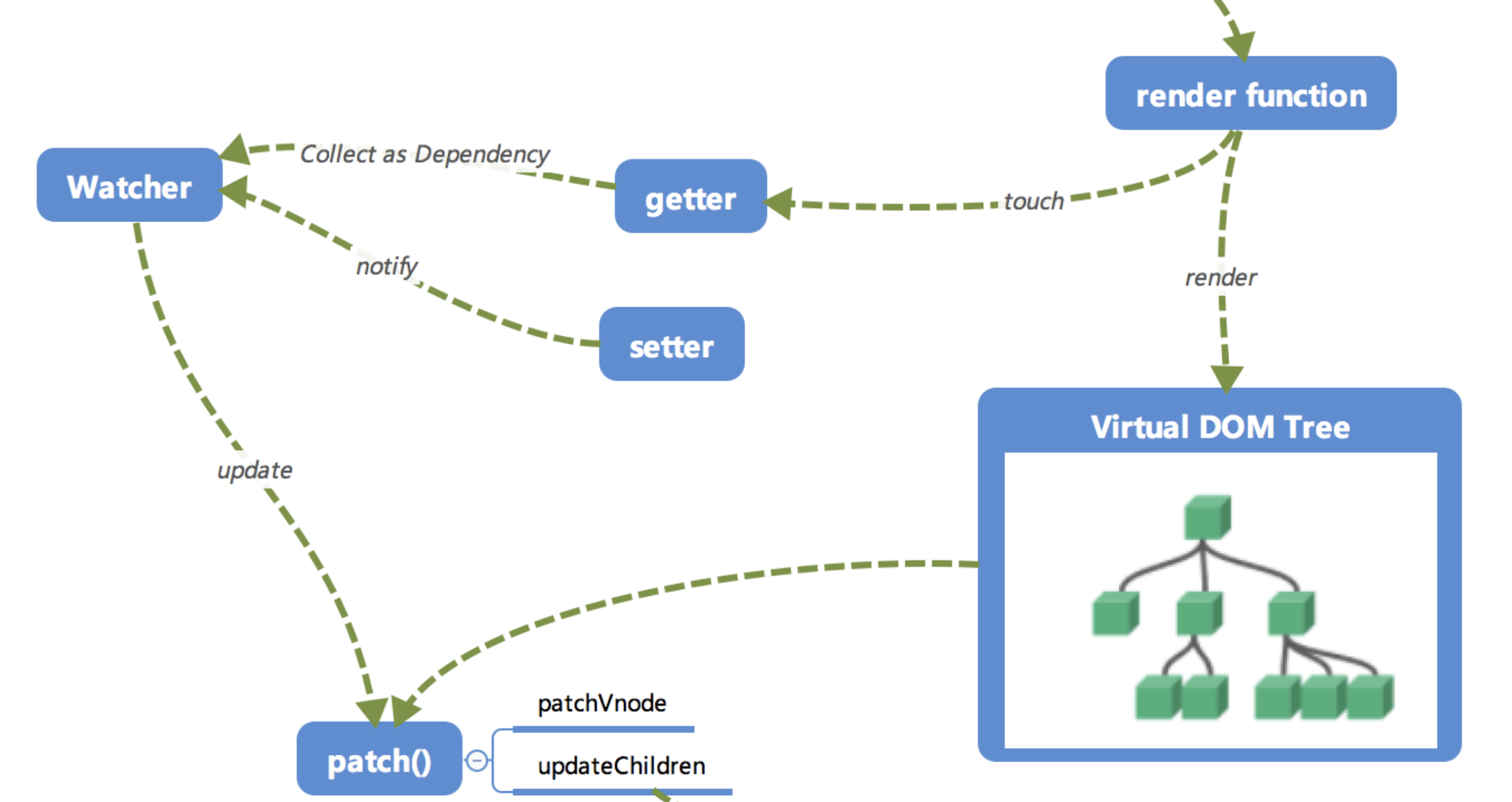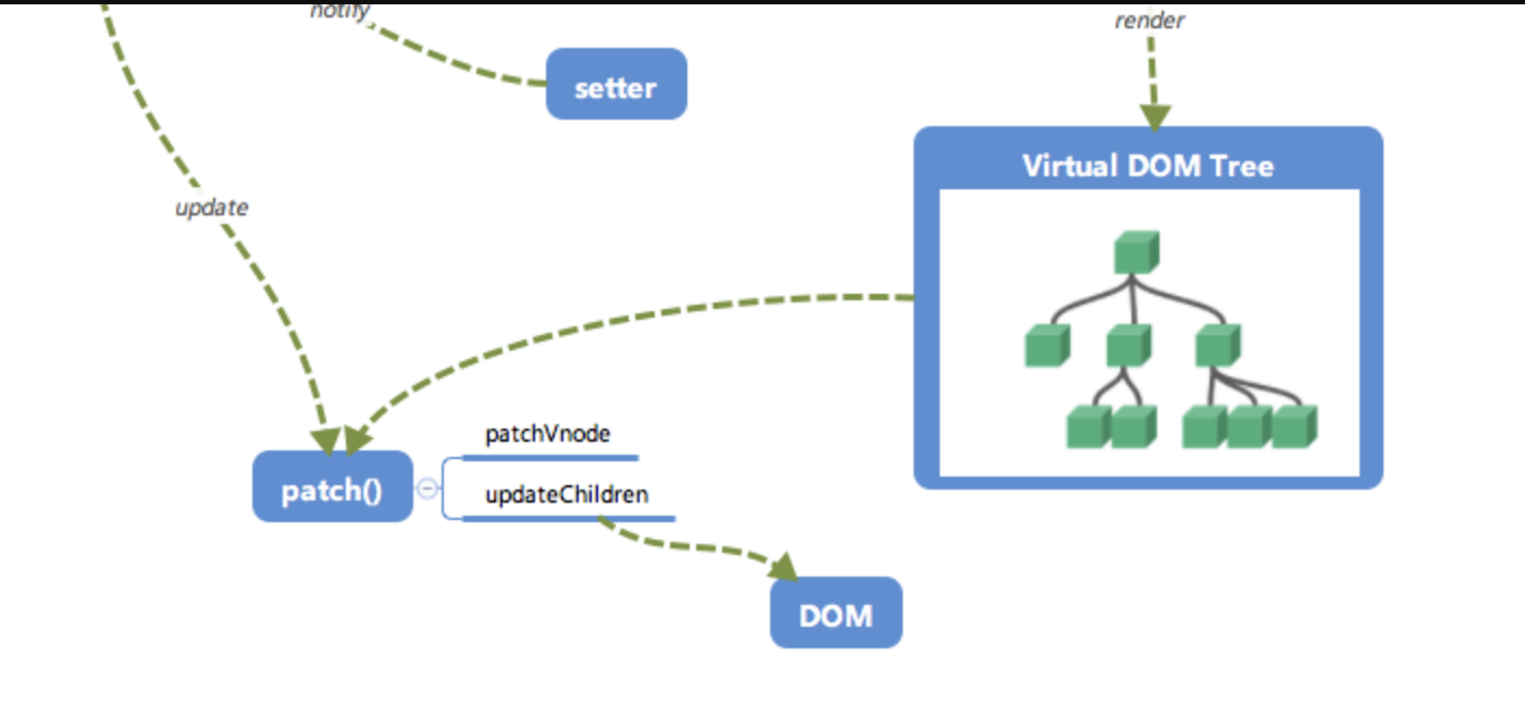 setter,setter通知之前「 依赖收集 」得到的 Dep 中的每一个 Watcher,告诉它们自己的值改变了,需要重新渲染视图。这时候这些 Watcher 就会开始调用update来更新视图,当然这中间还有一个patch的过程以及使用队列来异步更新的策略,这个我们后面再讲。
