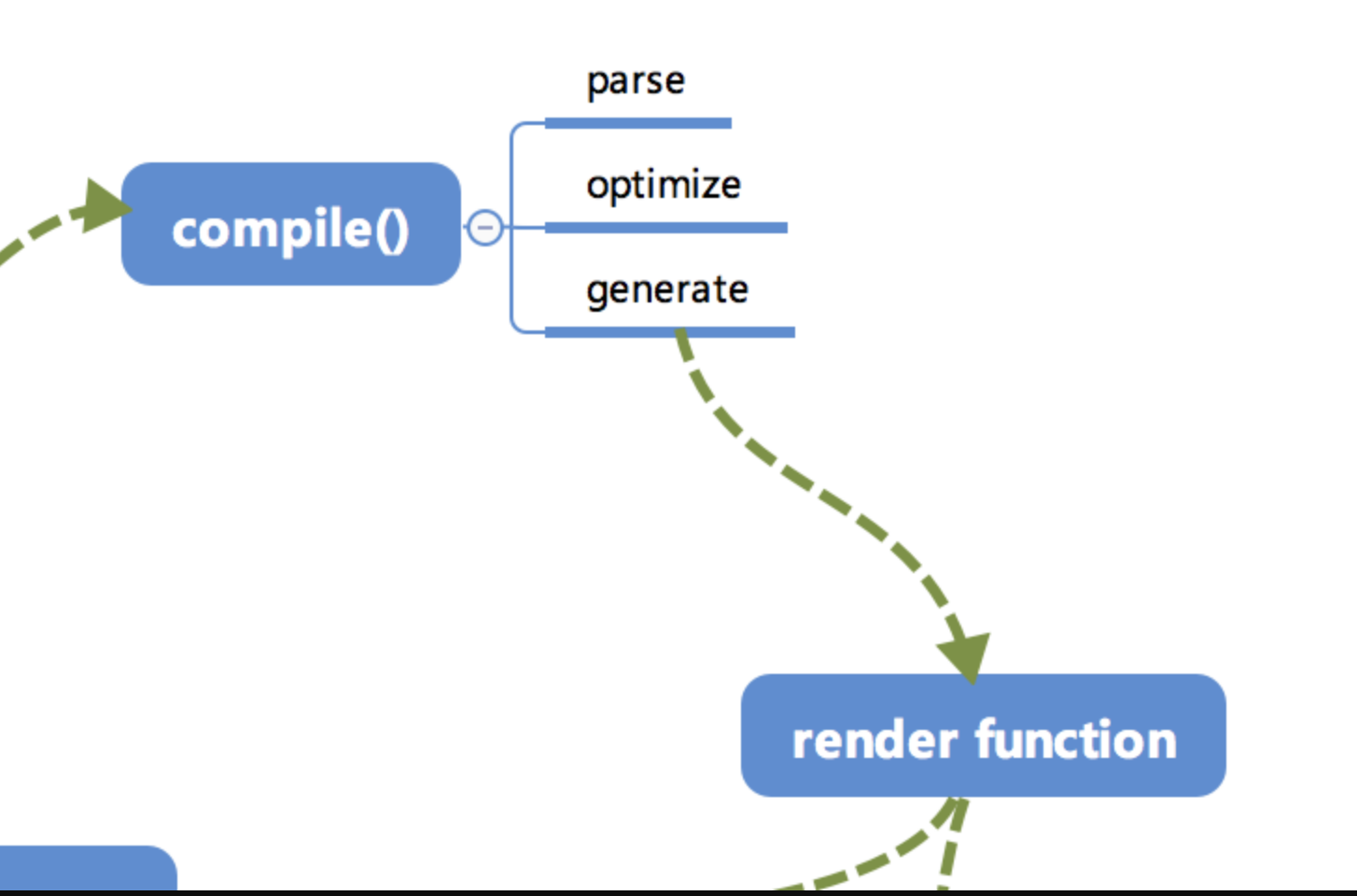 compile编译可以分成 parse、optimize 与 generate 三个阶段,最终需要得到 render function。