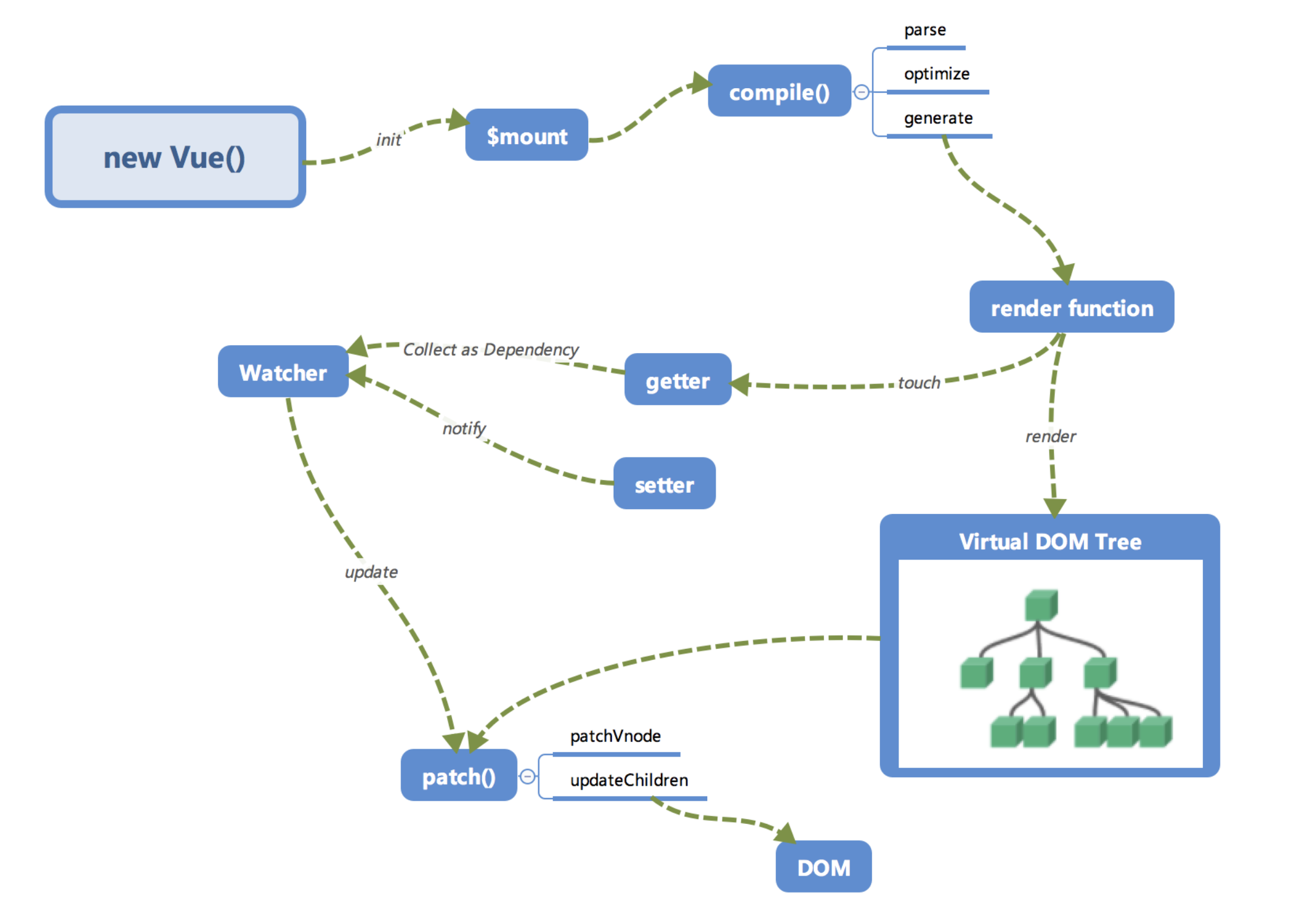 setter -> Watcher -> update的流程来修改对应的视图,那么最终是如何更新视图的呢? - 当数据变化后,执行 render function 就可以得到一个新的 VNode 节点,我们如果想要得到新的视图,最简单粗暴的方法就是直接解析这个新的