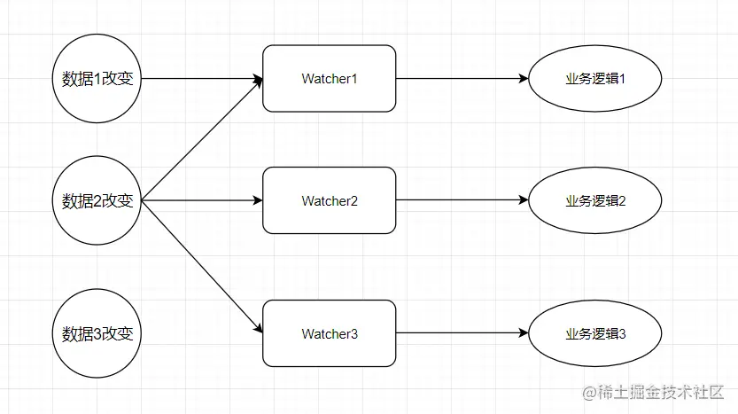 每个watcher和数据之间的关系要么是1对1,要么是多对多关系(这与watcher的类型有关),要不是没有联系。watcher和业务逻辑只有1对1关系。