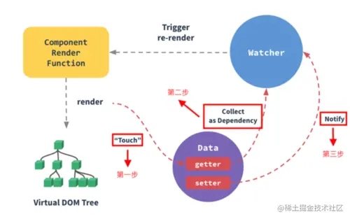 • 第三步,状态变更后,触发 dep.notify() 函数,该函数再进一步触发 Watcher 对象 update 函数,执行watcher的重新计算。