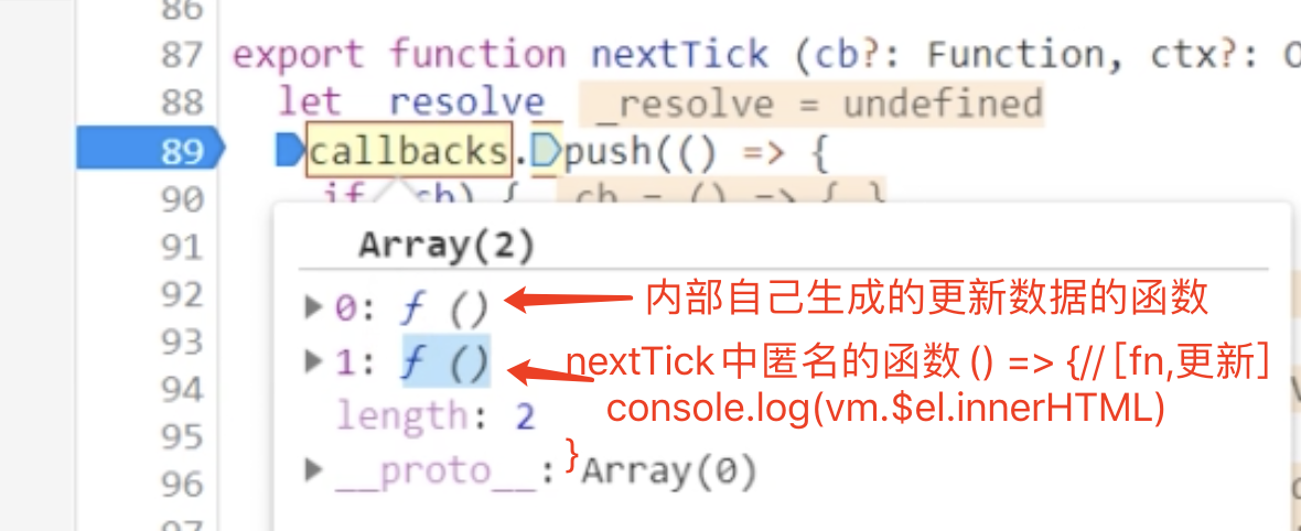 nextTick方法主要是使用了宏任务和微任务,定义了一个异步方法.多次调用nextTick会将方法存入队列中,通过这个异步方法清空当前队列。所以这个nextTick方法就是异步方法