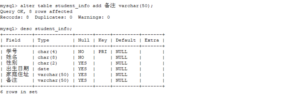 alter table student_info add 备注 varchar(50);