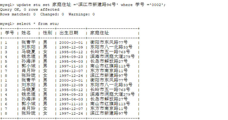 update stu set 家庭住址 ='滨江市新建路96号' where 学号 ='0002';