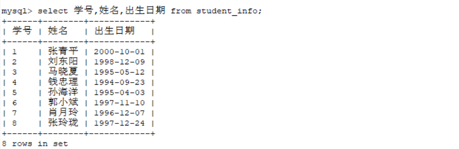 select 学号,姓名,出生日期 from student_info;