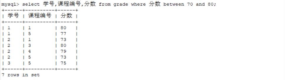 select 学号,课程编号,分数 from grade where 分数 between 70 and 80;