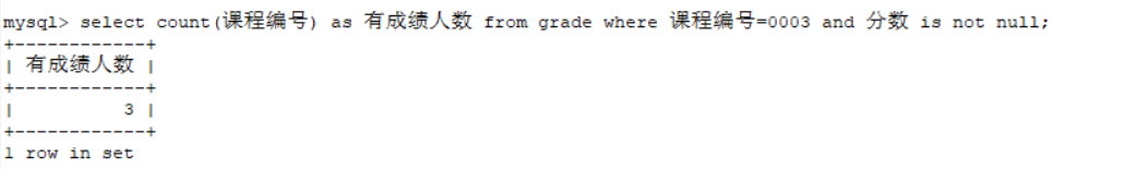select count(课程编号) as 有成绩人数 from grade where 课程编号=0003 and 分数 is not null;