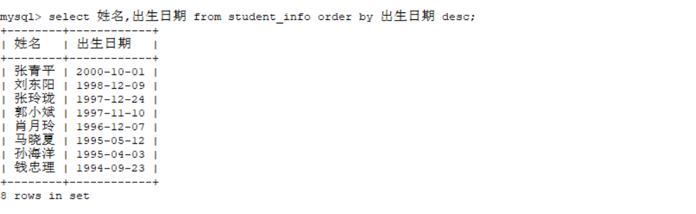 (4)查询student_info的姓名和出生日期,查询结果按出生日期从大到小排序。