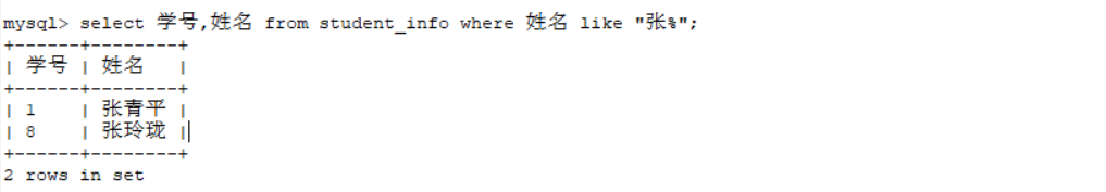select 学号,姓名 from student_info where 姓名 like "张%";