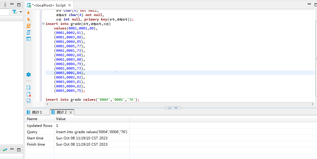 7.为grade表添加数据行:学号为0004、课程编号为0006、分数为76。